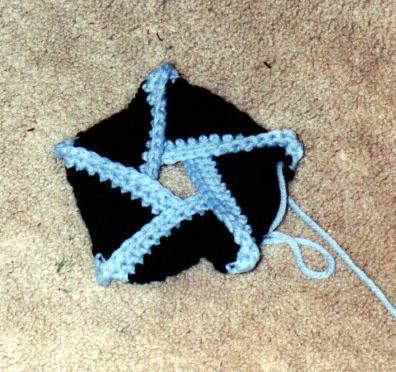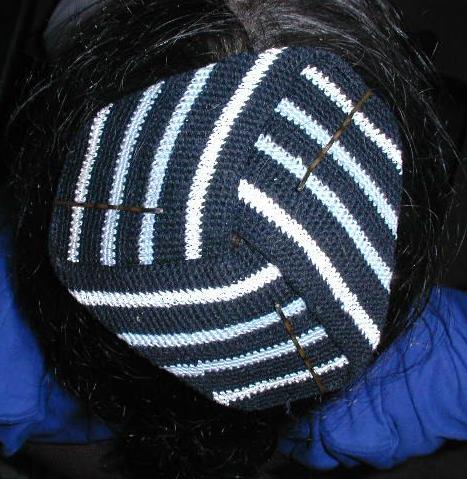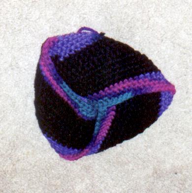 There are other possibilities too. Crocheting a Möbius strip is somewhat easier than knitting one. Just make a chain and close it off into a loop, but make a half-twist, so you first crochet into the "wrong" side and then into the "right" side as you go around. Then just single-crochet 'round and 'round, building up the strip. Crocheting is assymmetrical much as knits and purls are, but there's no purl for crocheting, so you wind up with a band which has different stitching on each half. Which is not really a bad thing. Crocheting is easy and quick, so this is an easy way to throw a quick Möbius strip together, in case you need one for a last-minute topologist party or something. It also isn't limited in size like working with a circular needle is: you can make it as big or small as you like. My wife made me a nice Möbius scarf several feet in diameter. You can also have fun with the colors; remember that when you make a full circuit around the work, it adds a stripe to both "edges." In that vein, I now have a bit of wearable topological art. Being of the Jewish persuasion, I wear a kipah (or yarmulka: a skullcap) all the time. And now I wear one that is a three half-twist Möbius strip, folded into a flat triangle. Remember, it's a one-sided strip so long as it has an odd number of half-twists, and all odd-half-twisted strips are topologically equivalent. You can change them into each other--if you're allowed to work in four dimensions. If you picture that the surface could pass through itself, you can see how it would go. I used three half-twists instead of one because it has better symmetry that way when folded up. My wife crochets faster and better than I do, so I asked her to make it for me (and all through it, she kept saying, "Mark, you are weird.") The one pictured here is not the one I wear; the one I wear is made of much thinner thread and finer stitches, and is colored differently. It's black with one light blue stripe and one white/silver stripe (though of course it looks like two of each because of how they loop around each other). Here's a picture of it.