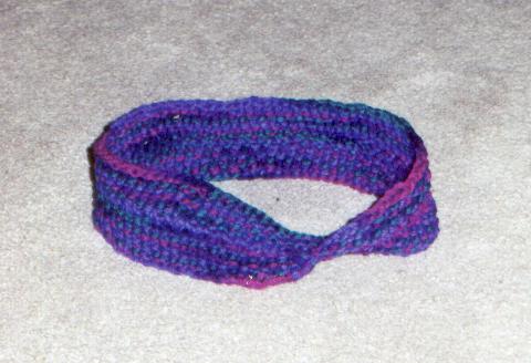 Here's what I did: start with a nice big circular needle (29-inch or so). I used one size 9, but it shouldn't matter much. Cast on a mess of stitches, at least enough to cover half the needle. Better to make it close to the whole thing, but make sure to cast on loosely (the success of the whole thing depends on a lot of give everywhere). Also, don't cast on too many stitches. You need them well spaced out, since the needle is actually going to hold twice as many. Also, you can't even get started if the last stitches are on the metal needle at the end of the flexible line. Once you have them cast on, carefully line up the two ends, preparing to close the circle. Make very sure that the stitches are not twisted... except for the twist you put in! Carefully make a half-twist, so that you are knitting into the bottoms of the cast-on stitches. This is bizarre, so pay attention. You are not knitting into the loops as usual, you are knitting into the stuff underneath the loops that holds them together. There are two strings running parallel there; I usually knit into the farther one. I suppose you could knit through both and maybe get better results. Note also that as you knit, you are not removing anything from the needle (or it would unravel). So you knit a stitch but leave it on the needle, and you move on and knit the next one. And so you wind up with your needle looping around itself another time: when you get back to the start and finally start knitting into the tops of the stitches, the needle has looped around twice. It's hard to describe, and a little mind-blowing the first time you see it, but it isn't all that complicated actually. For one-sided shapes like this I often find it good to use a stitch that looks the same from both sides, like "seed stitch" (I think that's what it's called: K 1, P 1 across, then K over all P stitches and P over all K stitches from then on). It also has the advantage over stockinette that it doesn't have the same tendency to curl. Still, the first one I did was stockinette, and you should try one: it's a little brain-bending to see how it works out, with the knit and purl sides and how they line up seamlessly. I suppose ideally one should work out the parity of the number of stitches so things work out right with the alternating knits and purls, but I've never bothered (so what if there's a small discontinuity?) It's a weird feeling: you knit around twice to truly do a row; the stitches go around, pass under your needles without being knitted, and then come back around again to be knitted. And of course at the end there's only a cast-off edge. With only one edge, obviously you can't have a cast-on and a cast-off edge! The yarn you started with sticks out of the center of the band.